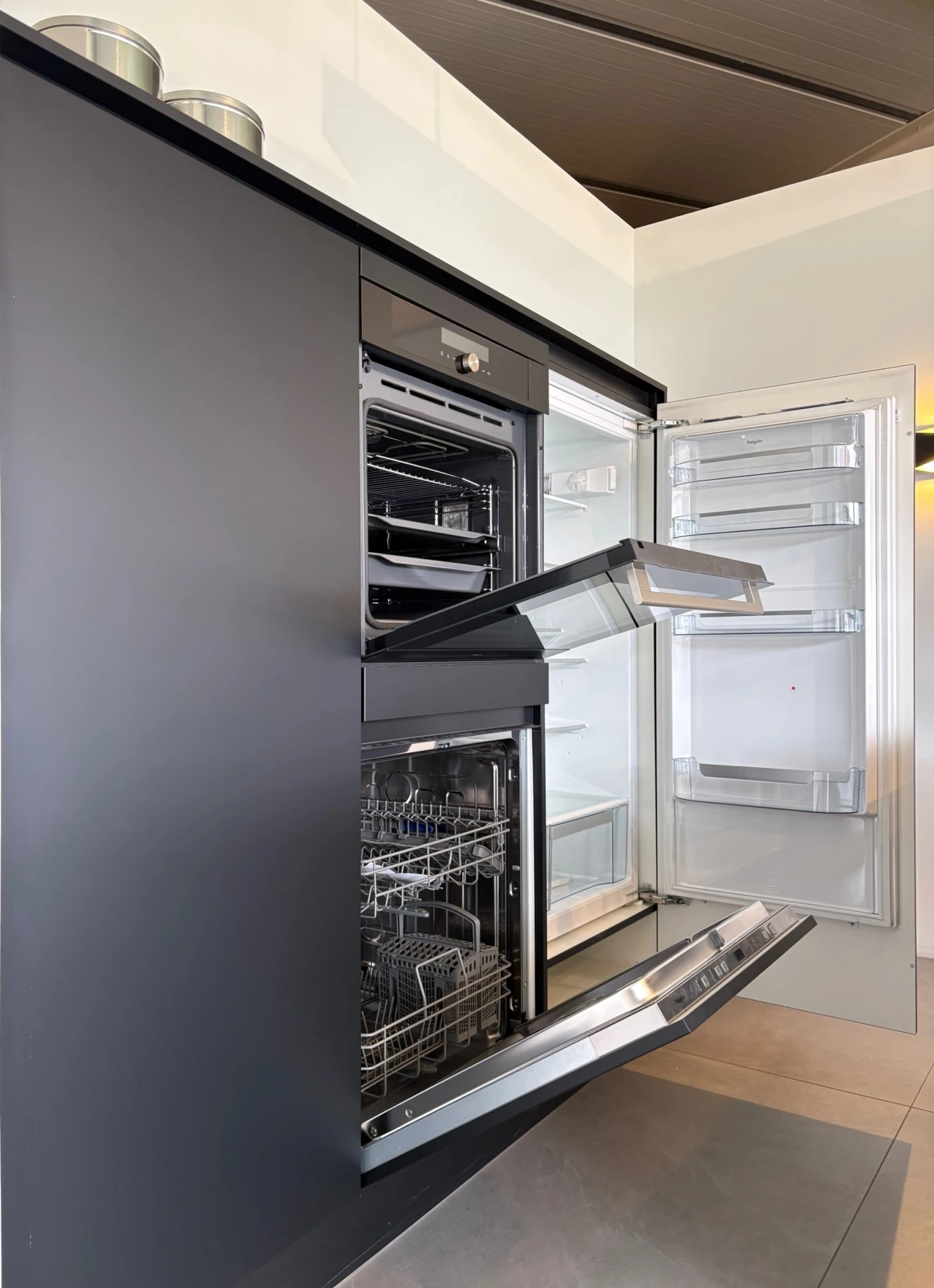 - Apparatuur Pelgrim/Etna, vaatwasser, inductie kookplaat, design eilandafzuigkap, oven 60 cm en koeler 122 cm